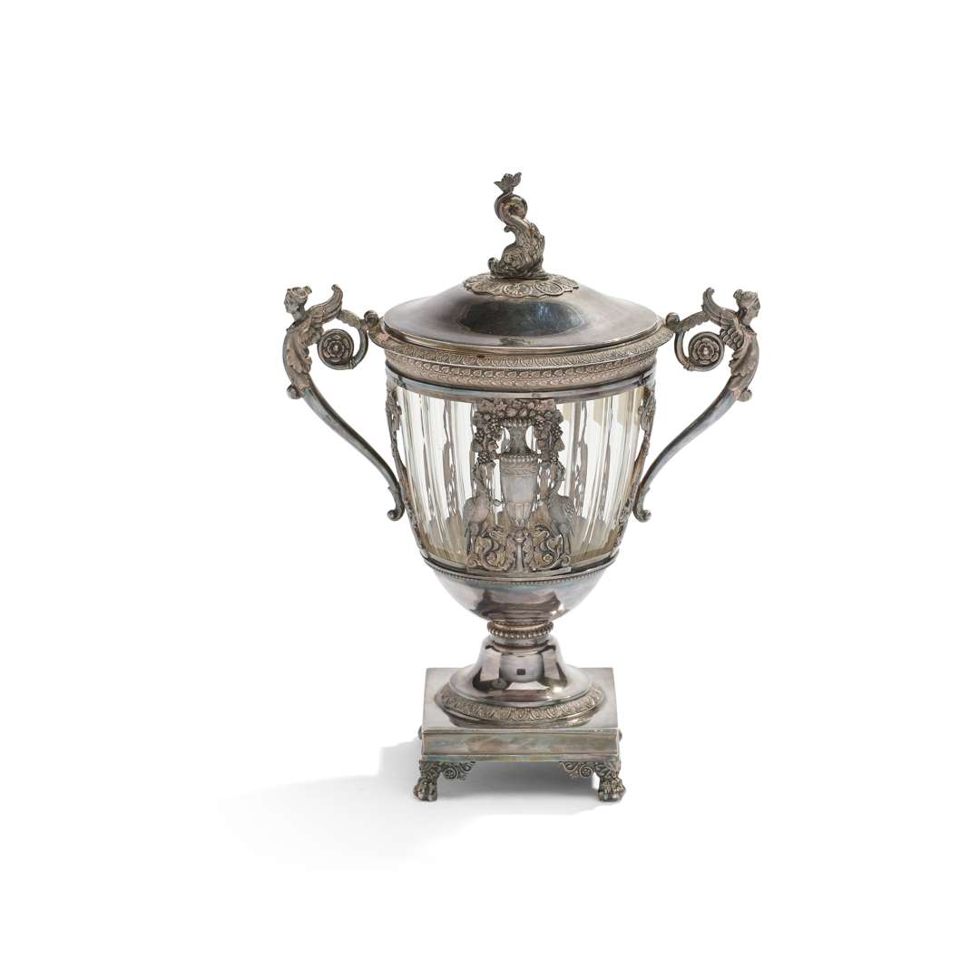 à monture en argent en forme de vase à l'Antique. La panse à décor ajourés d'amphores fleuries et flanqués de paons affronté. Les anses aux bustes de sphinges et le couvercle sommé d'un dauphin. Les bordures ornés de frises de palmettes. La base carré sur des pieds en griffe.