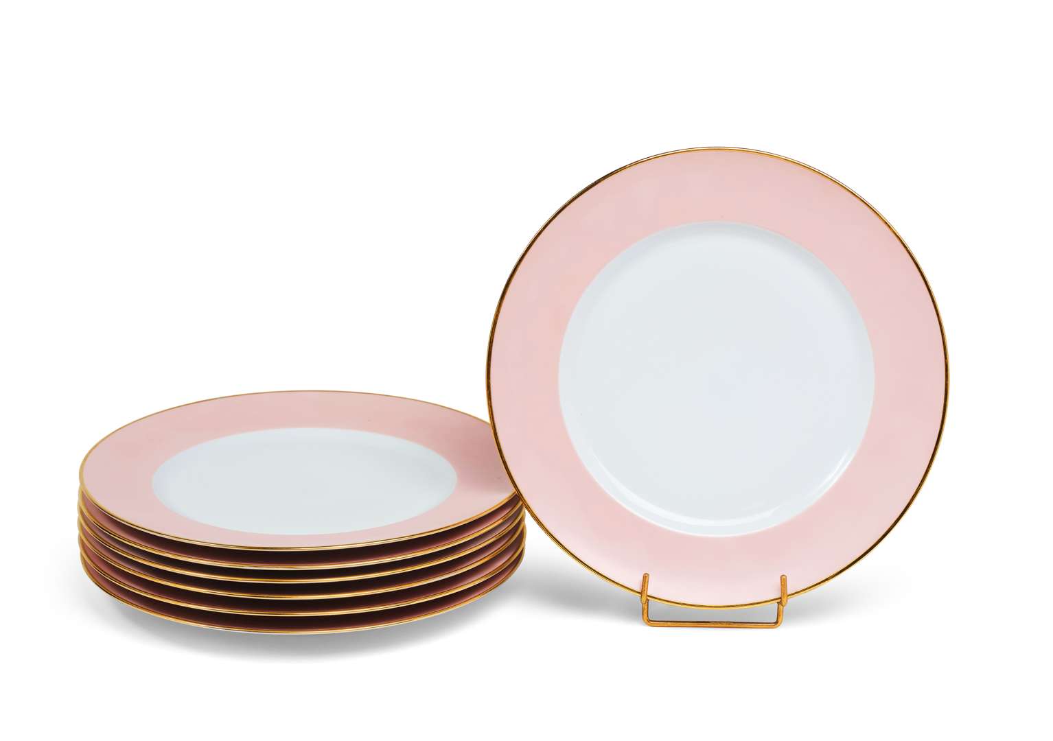 Suite de sept assiettes de table. L'aile couleur saumon et la bordure réhaussée à la dorure. Marquées au revers.