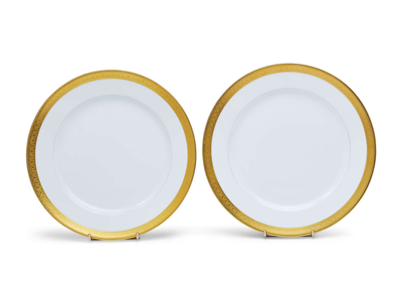 Paire d'assiettes de table en porcelaine blanche, modèle "Valençay".Marquées au revers.Diamètre : 27,5 cm.(en l'état)