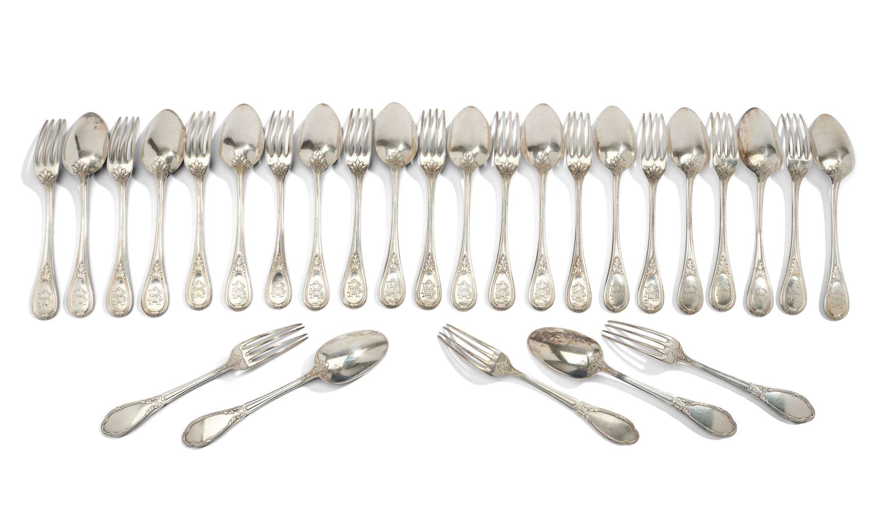 Partie de service en argent, de modèle filets. Les manches ornés de feuillages et les spatules monogrammées AB.