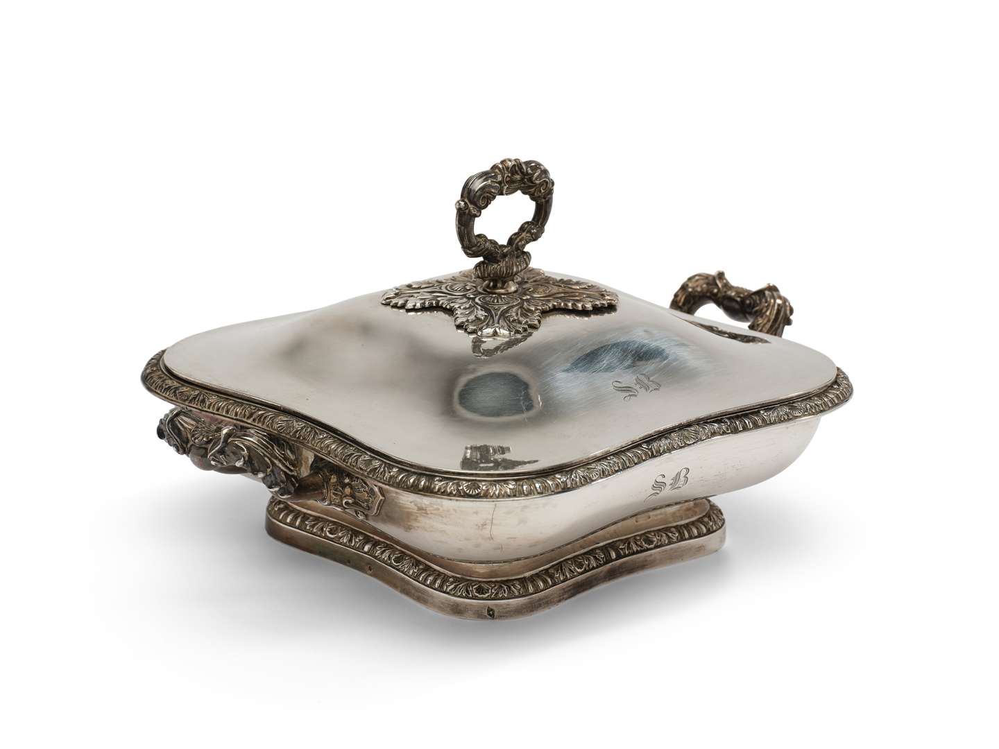 en argent, la panse aux initiales gravées : SB. Les bordures, les anses et la prise de préhension à décor de rinceaux feuillagés.