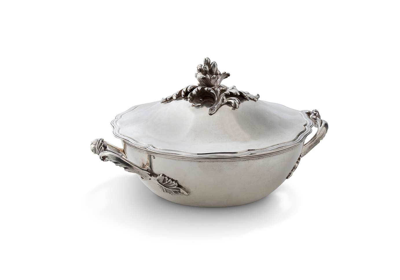 en argent et de forme chantournée. La panse unie, les anses feuillagées. Le couvercle à bordure moulurée de filets, les anses feuillagées. Le couvercle sommé d'une laitue.