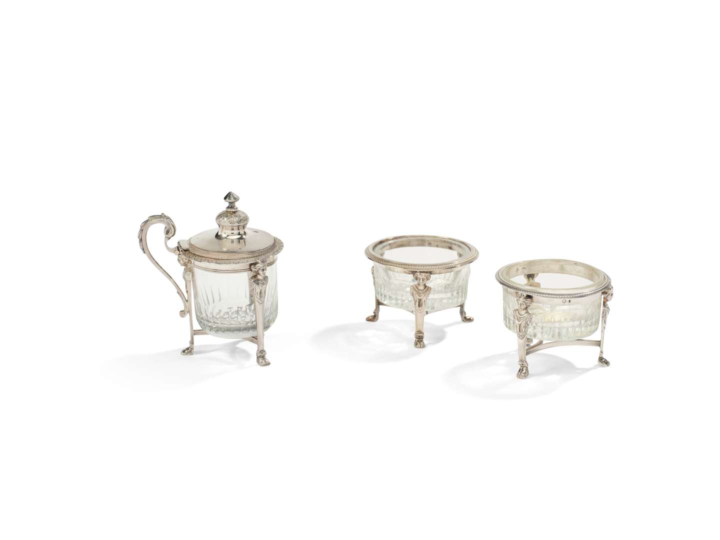 Comprenant un moutardier et deux salerons à monture en argent. Les montants en forme bustes en gaine de femmes.