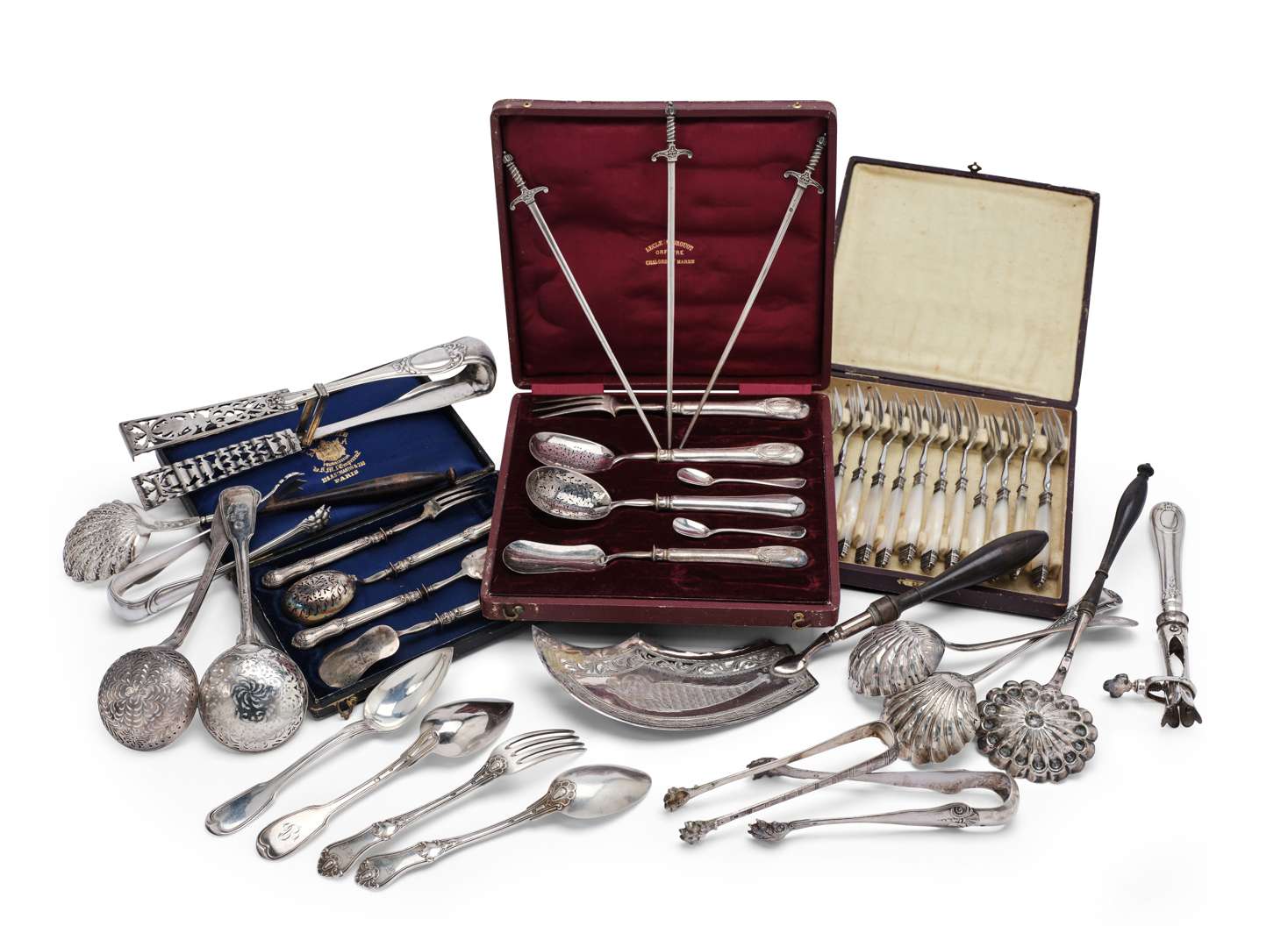 - un lot de couverts de service divers comprenant trois cuillères à saupoudrer, deux cuillères à punch, une pince, une pelle et une poignée. L'une des cuillères à saupoudrer au poinçons d'Ancien Régime : Paris, 1748. Maître orfèvre : AC et une colombe.