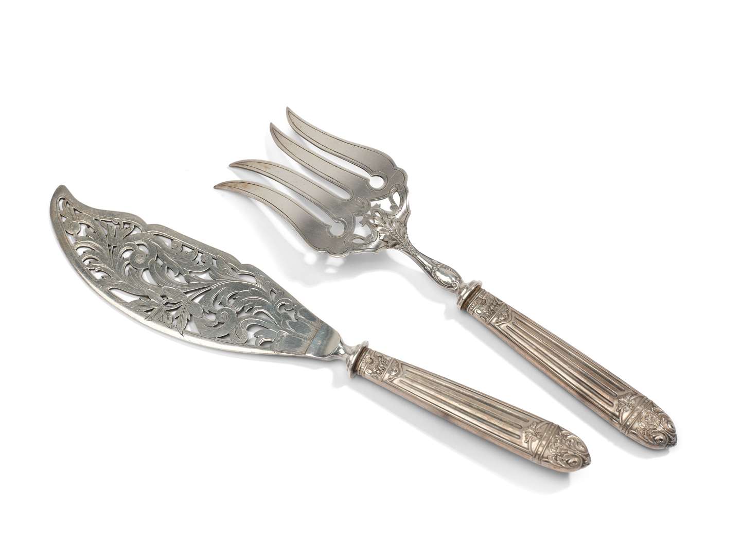 - Couverts à servir le poisson en argent fourré. Poinçon Minerve, pas de poinçon d'orfèvre.