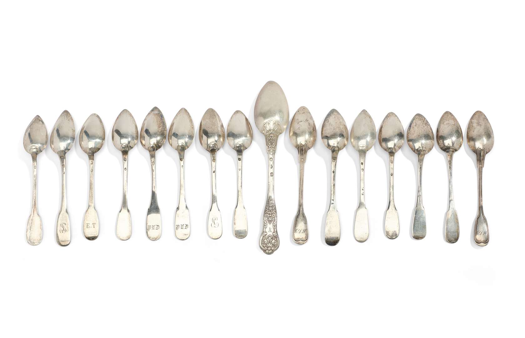 comprend quinze petites cuillers poinçonnées à la Minerve et une cuiller à entremets poinçonnée au Vieillard.