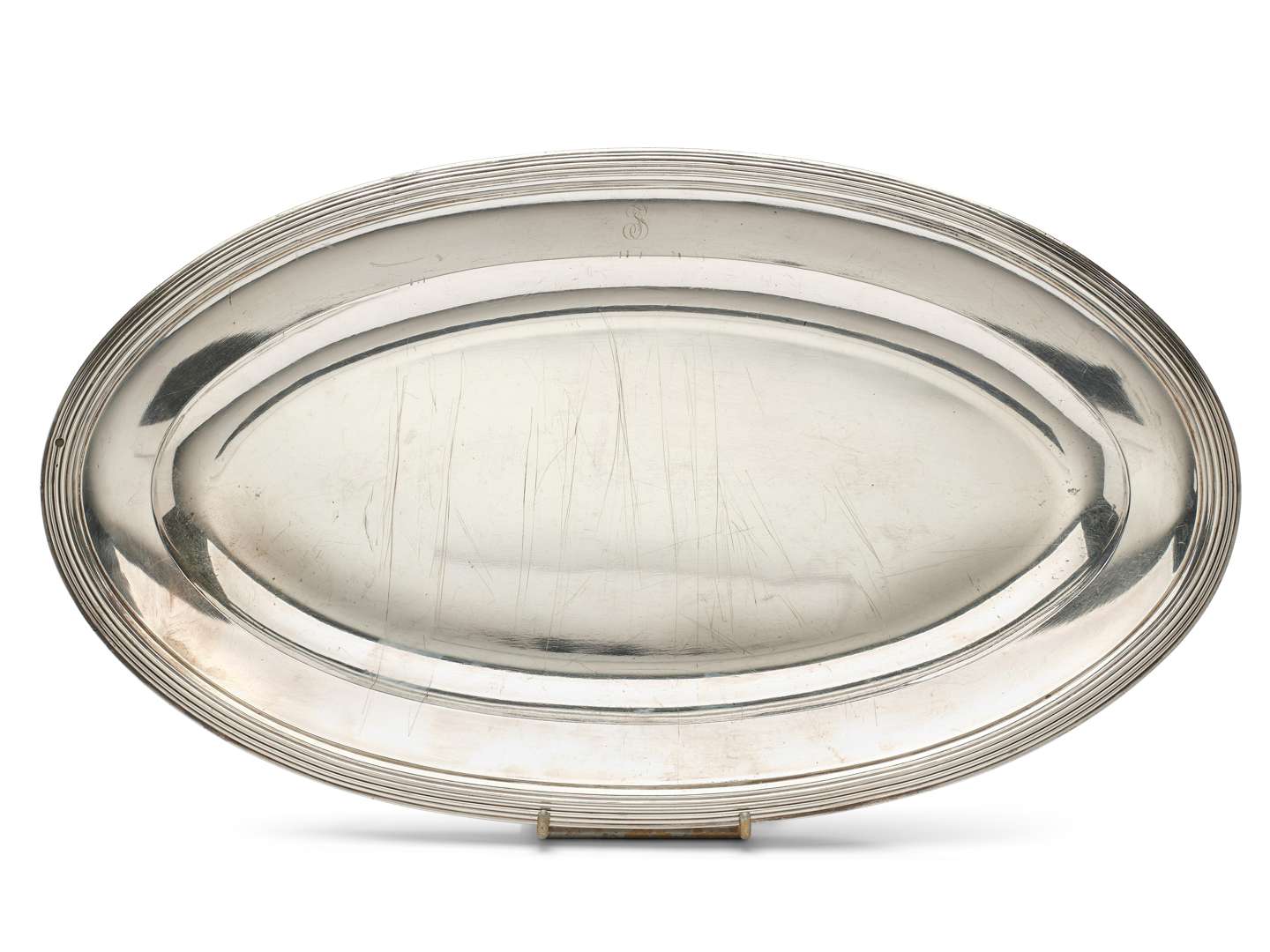 Plat en argent de forme ovale à bordure ciselé de filets. L'aile chiffrée TS.