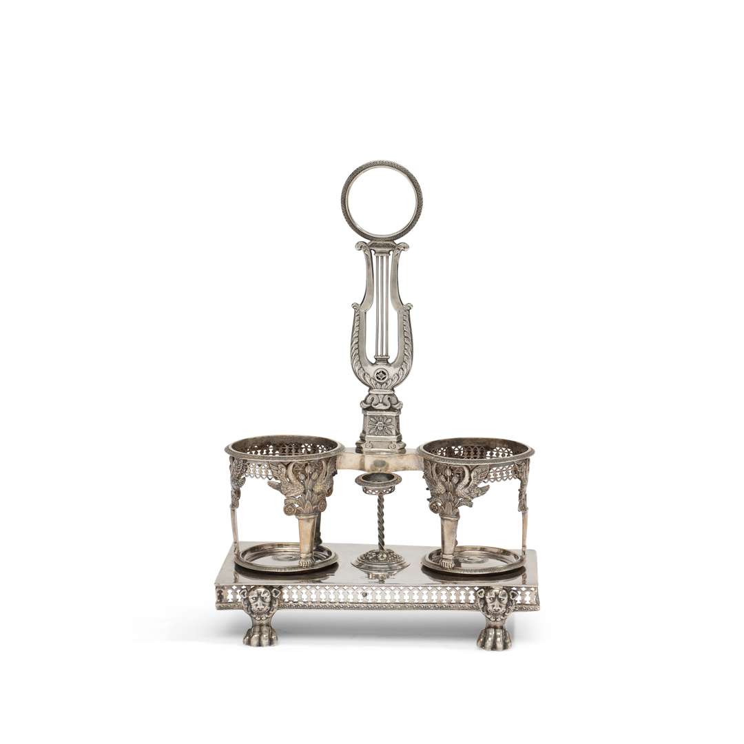 en argent, à base de forme rectangulaire ajourée d'arcatures et les contenants ajourés à décor de cygnes affrontés sur des gaines feuillagées.