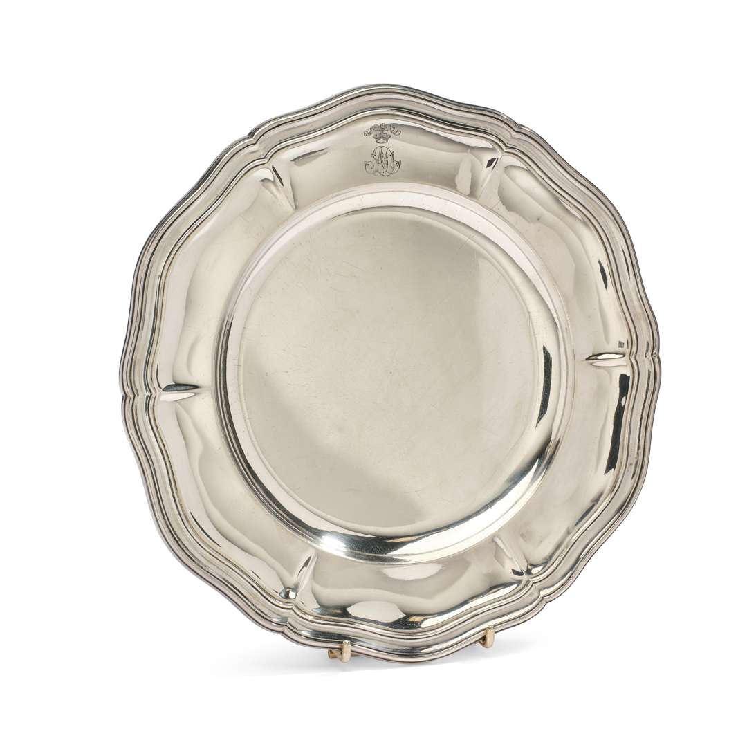 Plat circulaire en argent, modèle filets contours. L'aile gravée d'un monogramme : AD sous une toque à cinq plumes des comtes de l'Empire.