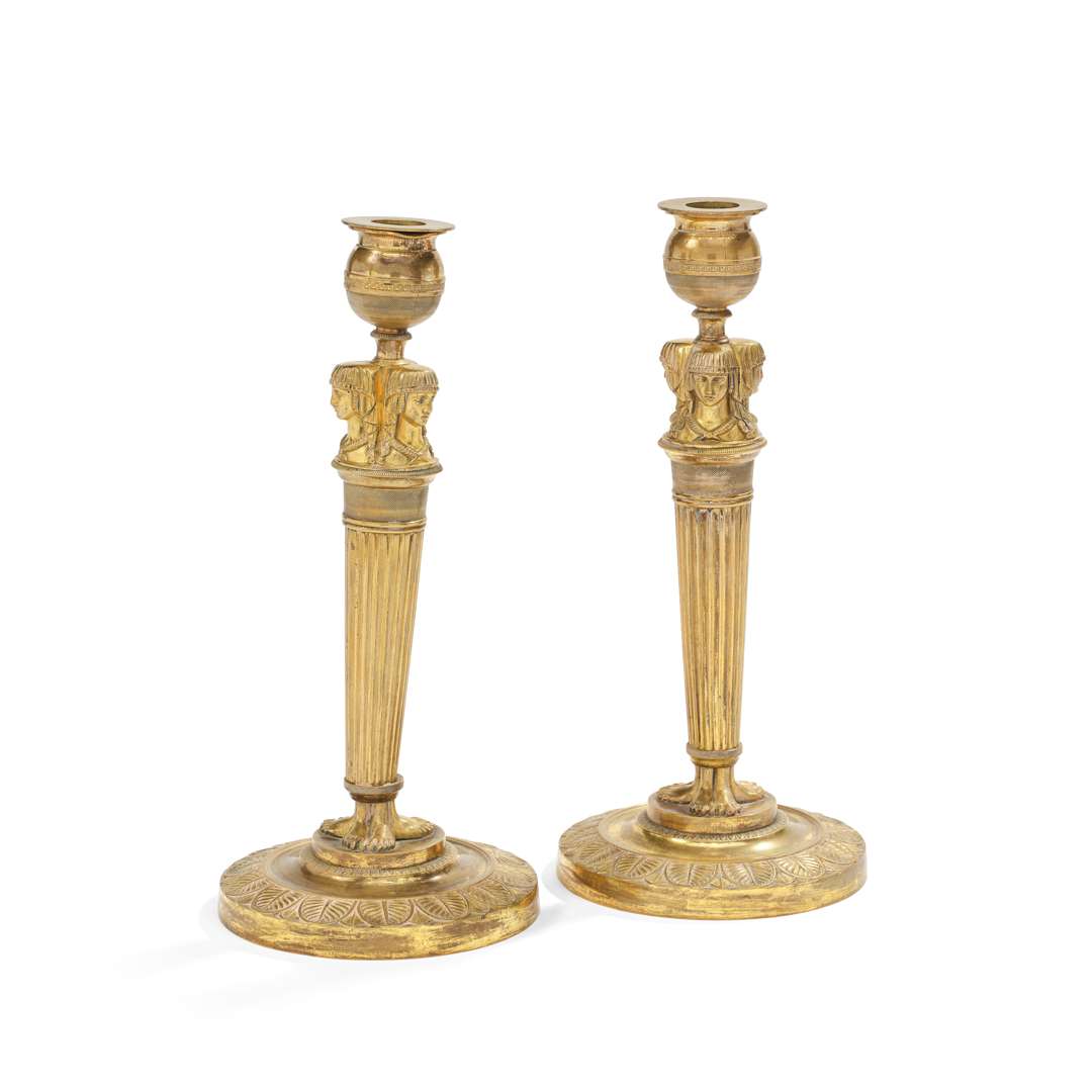 en bronze ciselé et doré. Les bases circulaire ornés de feuilles de lotus et les fût fuselés et cannelés sommés de bustes gainés. Les binets sphériques.