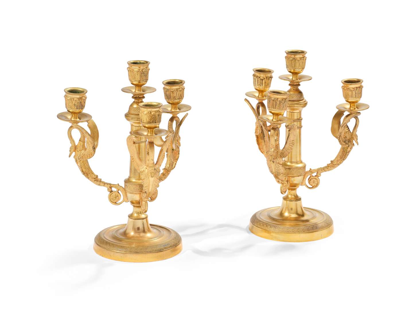 La base circulaire et le fût en forme de colonne baguée. Les bras de lumières aux buste de cygnes aux ailes déployées. Décor de frises de quartefeuilles et de feuilles d'eau.