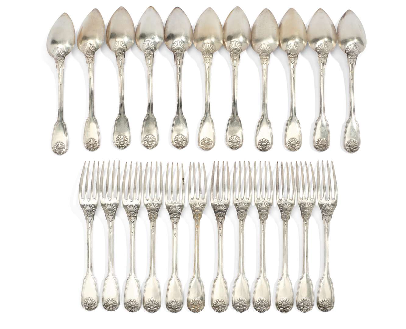en argent à modèle filets coquilles les spatules ornées de palmettes. Comprend onze cuillers et douze fourchettes.