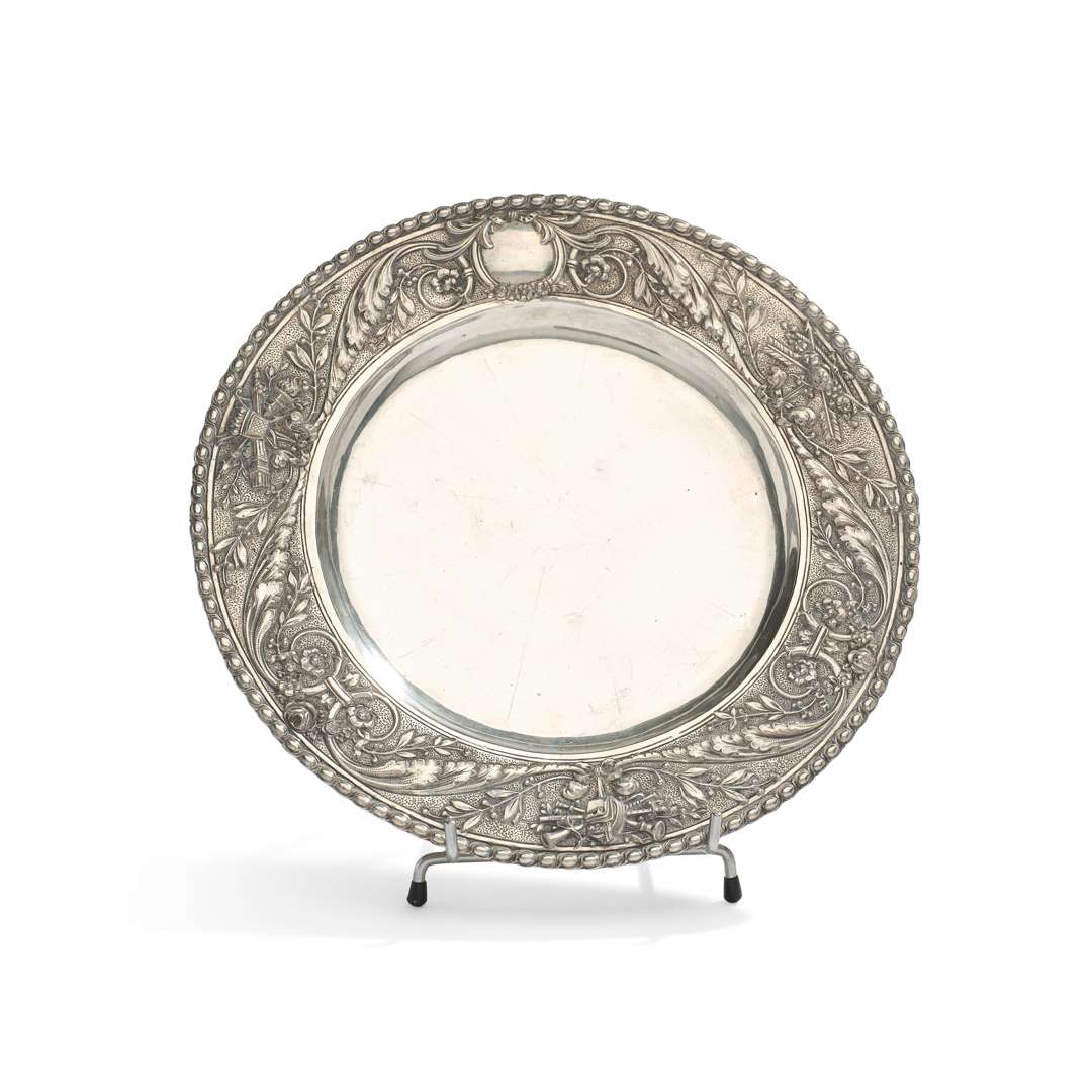 en argent. L'aile à décor au repoussé de frises de rinceaux feuillagés et de trophées.
