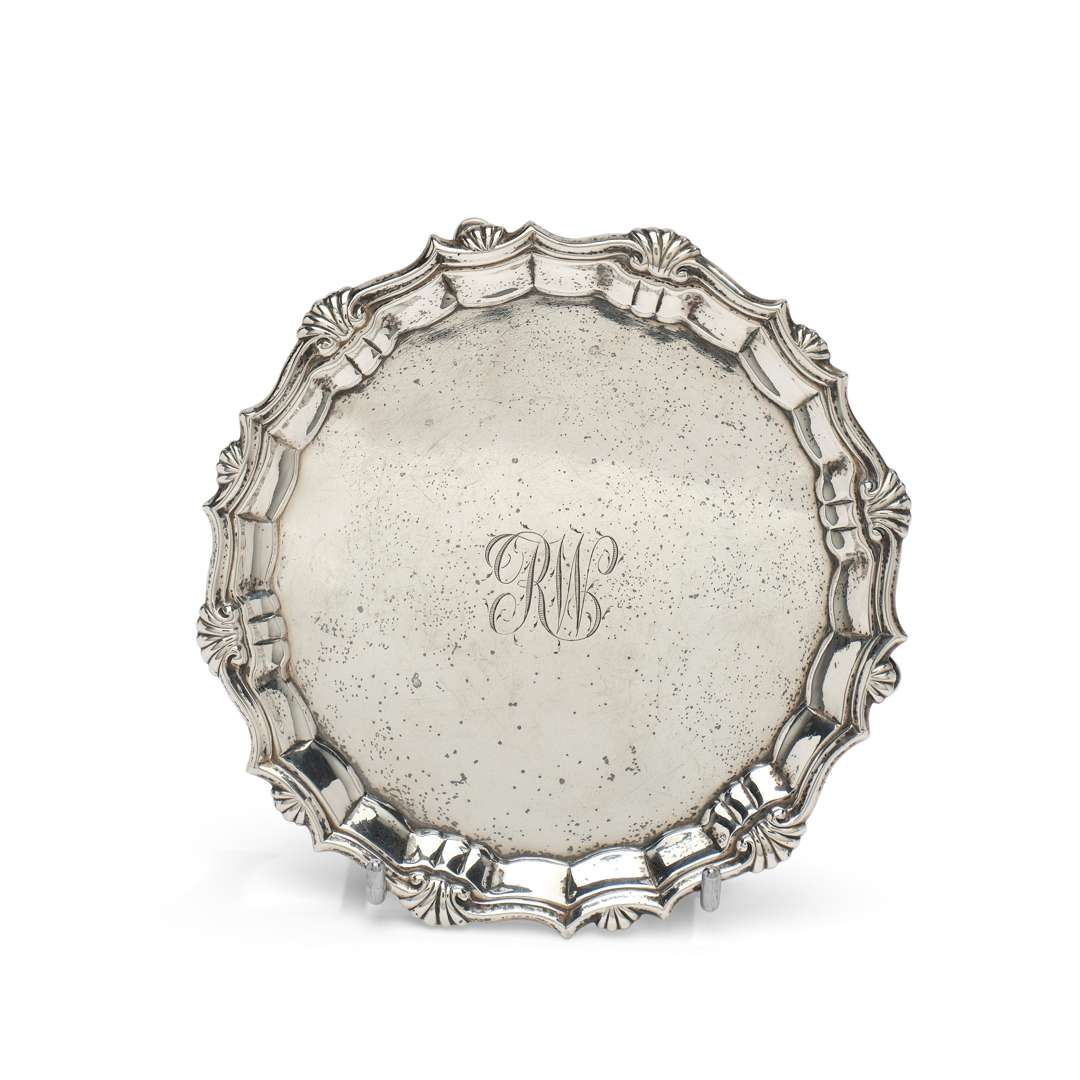 en argent, de forme polylobée. La bordure ornée de filets retenus par des coquilles. Le centre monogrammé RW.