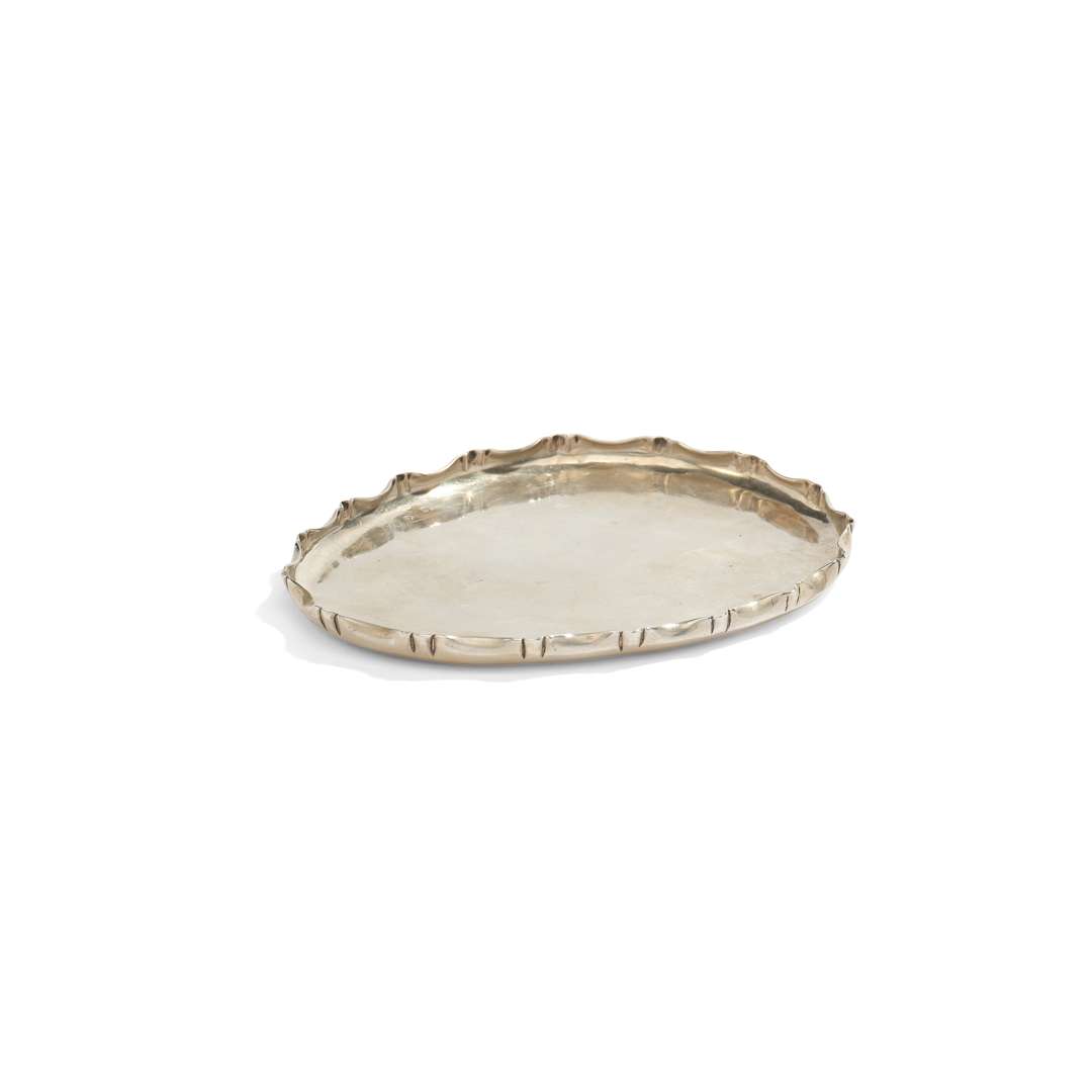 en argent de forme ovoïde, la bordure crénelée.