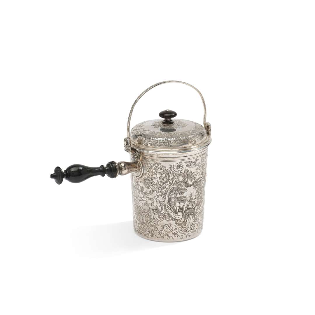 en argent. La panse de forme cylindrique et ansée à riche décor de style rocaille. Le manche latéral en bois tourné et noirci.
