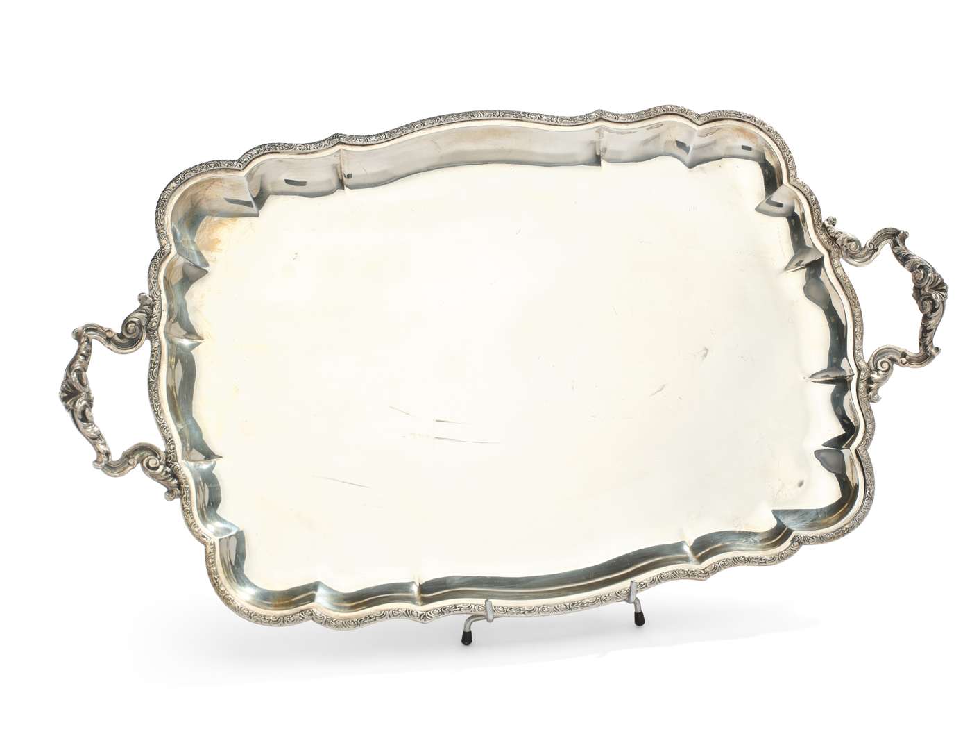 en argent 800°/°° de forme chantournée, les bordure et les anses décor de style rocaille.