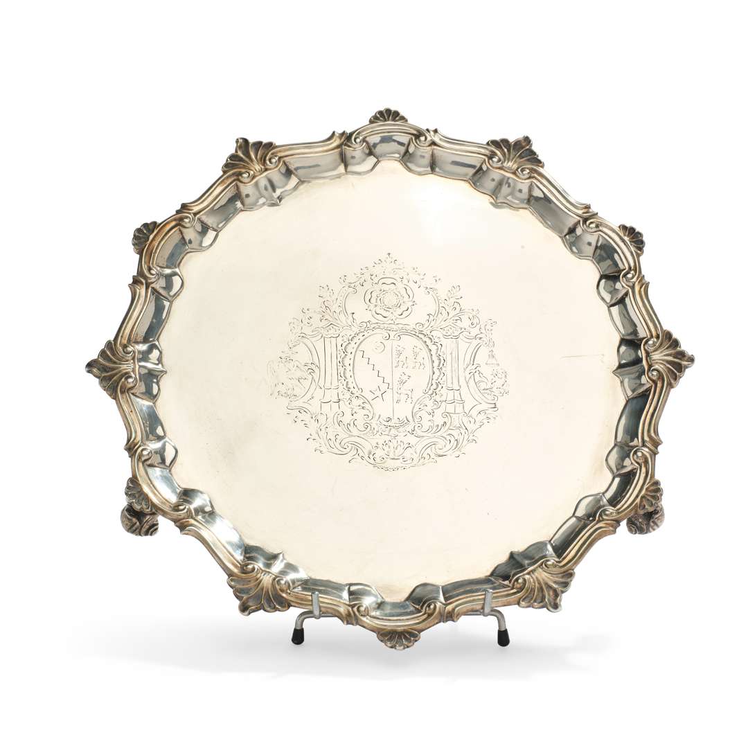 en argent, de forme chantournée, la bordure ornée de filets et de coquilles. Le centre gravé d'armoiries non identifiées insérées dans un cartouche aux colonnettes et rinceaux feuillagés. Le piétement tripode à enroulements.