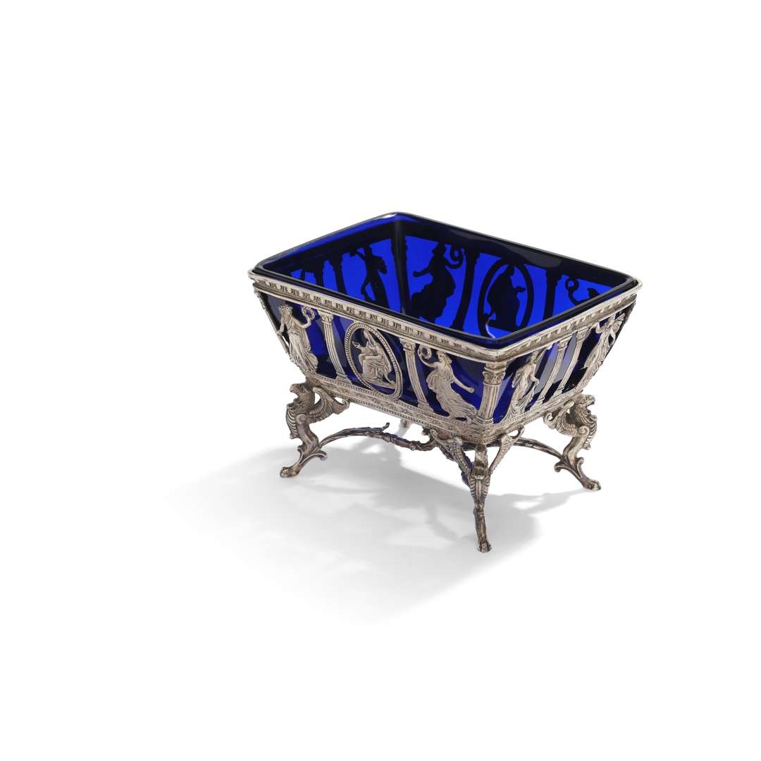 (beurrier ou saleron) à monture en argent de forme trapézoïdale. La panse à décor ciselé d'une colonnade logeant muses et vestales. Le piétement quadripode aux bustes de griffons relié par une entretoise.