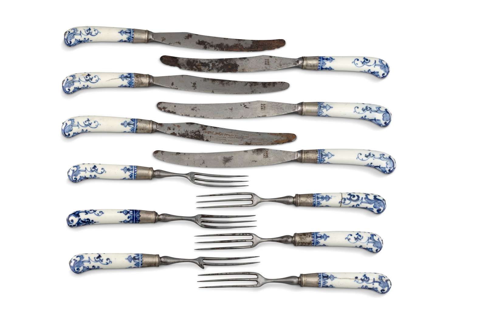 Les manches en forme de pistolet en porcelaine blanche et décor bleu dit " Formal Daisy" de festons et rinceaux à la manière française. Les viroles en argent. Les fourches et les lames en acier. Les lames des couteaux toutes marquées "IEFFERYS" pour Jefferys, coutelier.