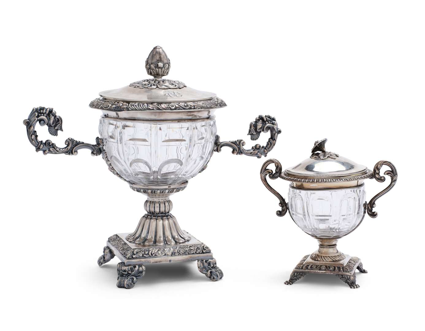 à montures en argent à décor de style rocaille, les panses en verre moulé.