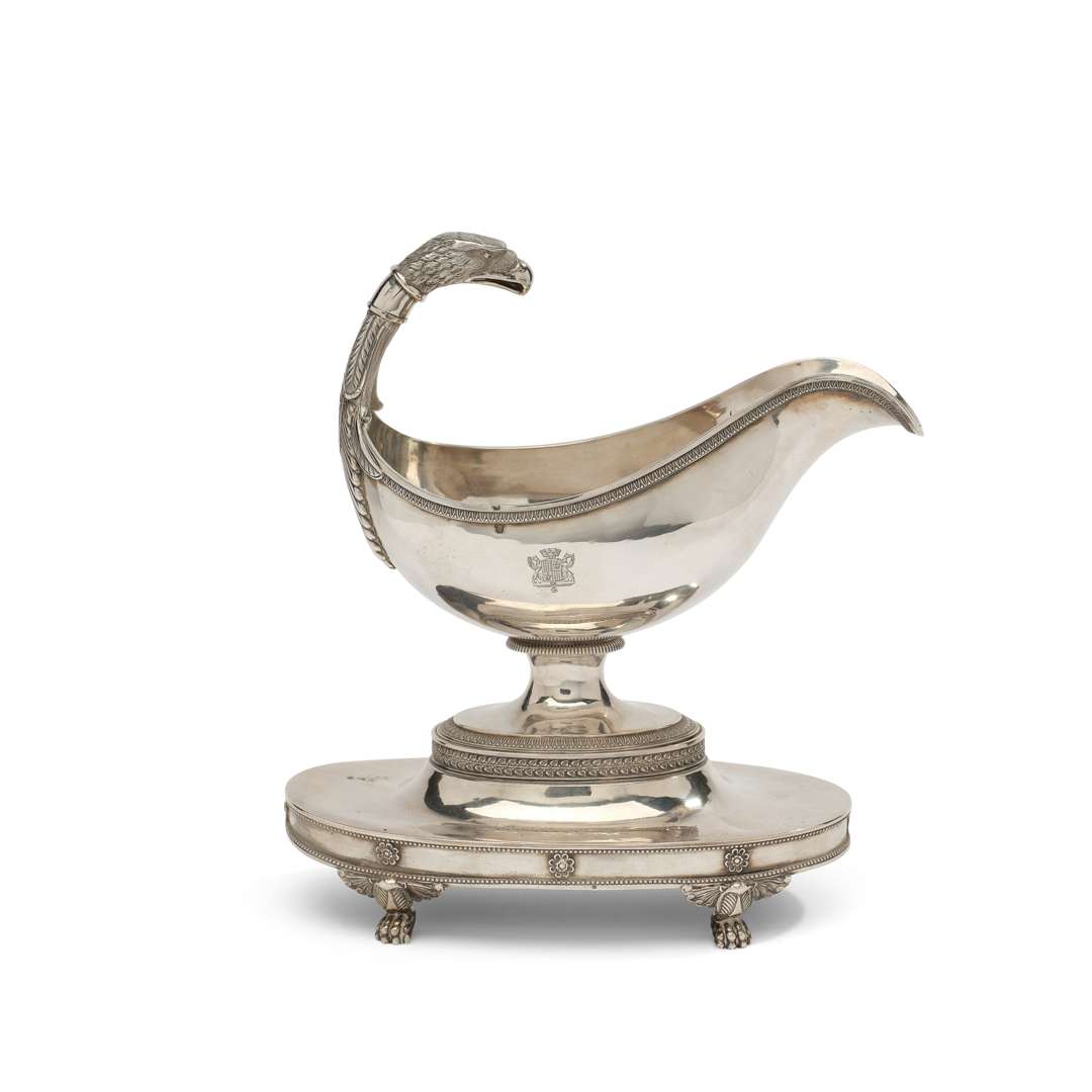 en argent, modèle à piédouche. Le corps uni ornée frises de végétaux, la prise finement ciselée d'une tête d'aigle. La panse gravée des armoiries de la famille Vialètes d'Aignan de Mortarieu sous une couronne de baron et avec une croix de la Légion d'Honneur sous la terrasse. Sur une base ovale à décor de rosaces et frises de perles, sur des pieds griffes.