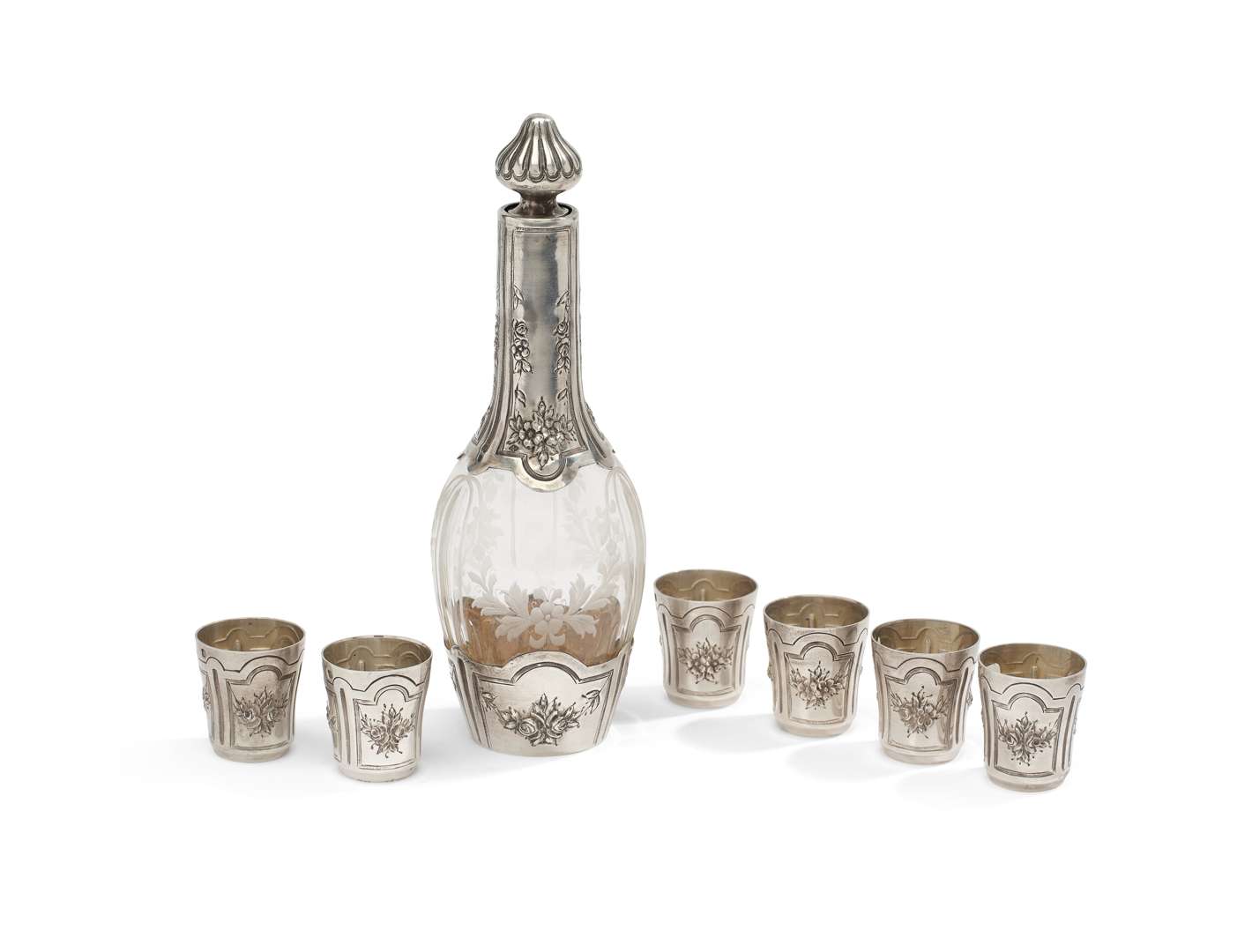 • une carafe à monture en argent, panse en verre taillé. Hauteur : 20,2. Poids brut : 306 g.