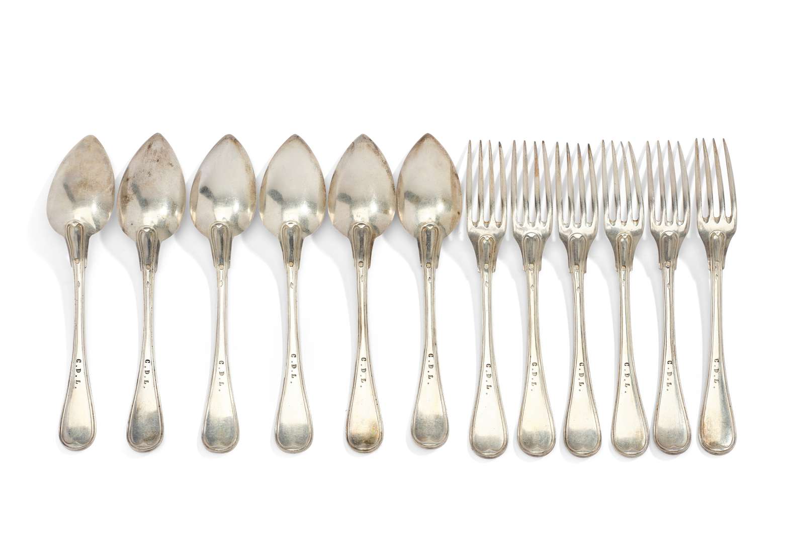 en argent à modèle filets (6 fourchettes et 6 cuillers). Les manches gravés GDL.