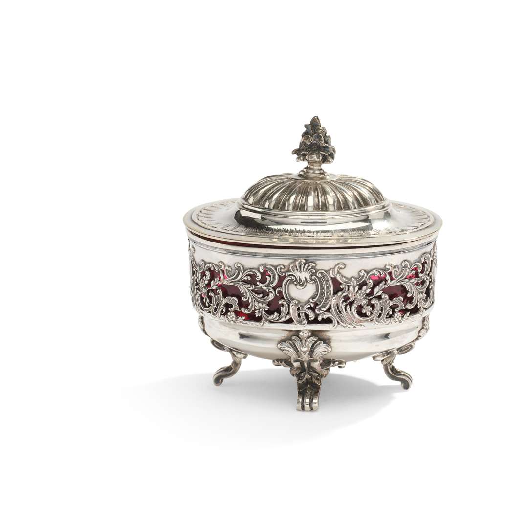 à monture en argent de forme ovale. La panse à décor ajouré de rocailles. Le couvercle orné de godrons et sommé d'un bouquet de roses.