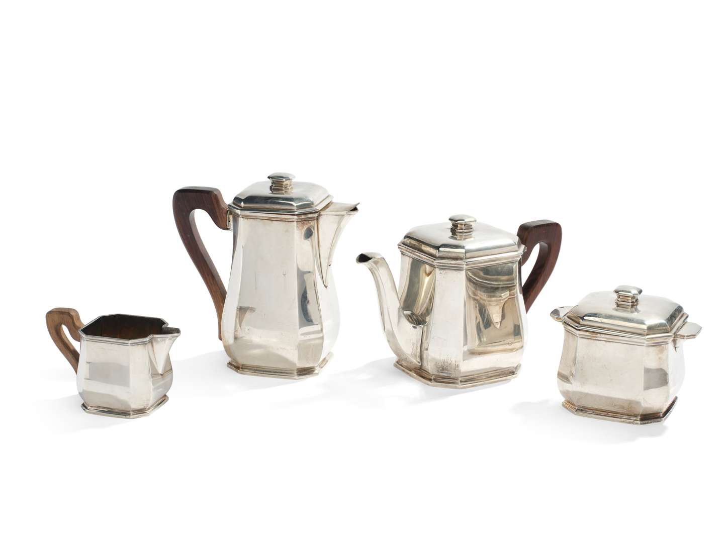 Service à thé et café en argent de forme balustre, les panses à pans coupés, les frétels sommés de prises de préhension à doucine. Les manches en sculpté de forme violonée.