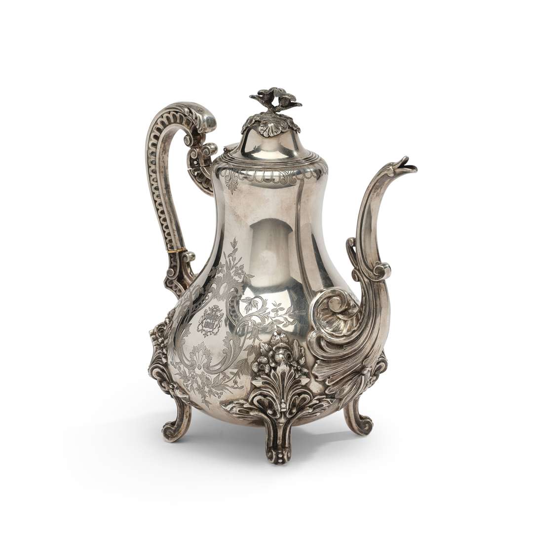 en argent à décor de style rocaille. Le frétel orné d'un couple d'oiseaux et les pieds et bec à enroulements. La panes ornée de chaque côté d'armoiries d'alliance des familles Laureau et Alviset de Maizières (alliées en 1867), sous un casque sommé d'une couronne comtale.