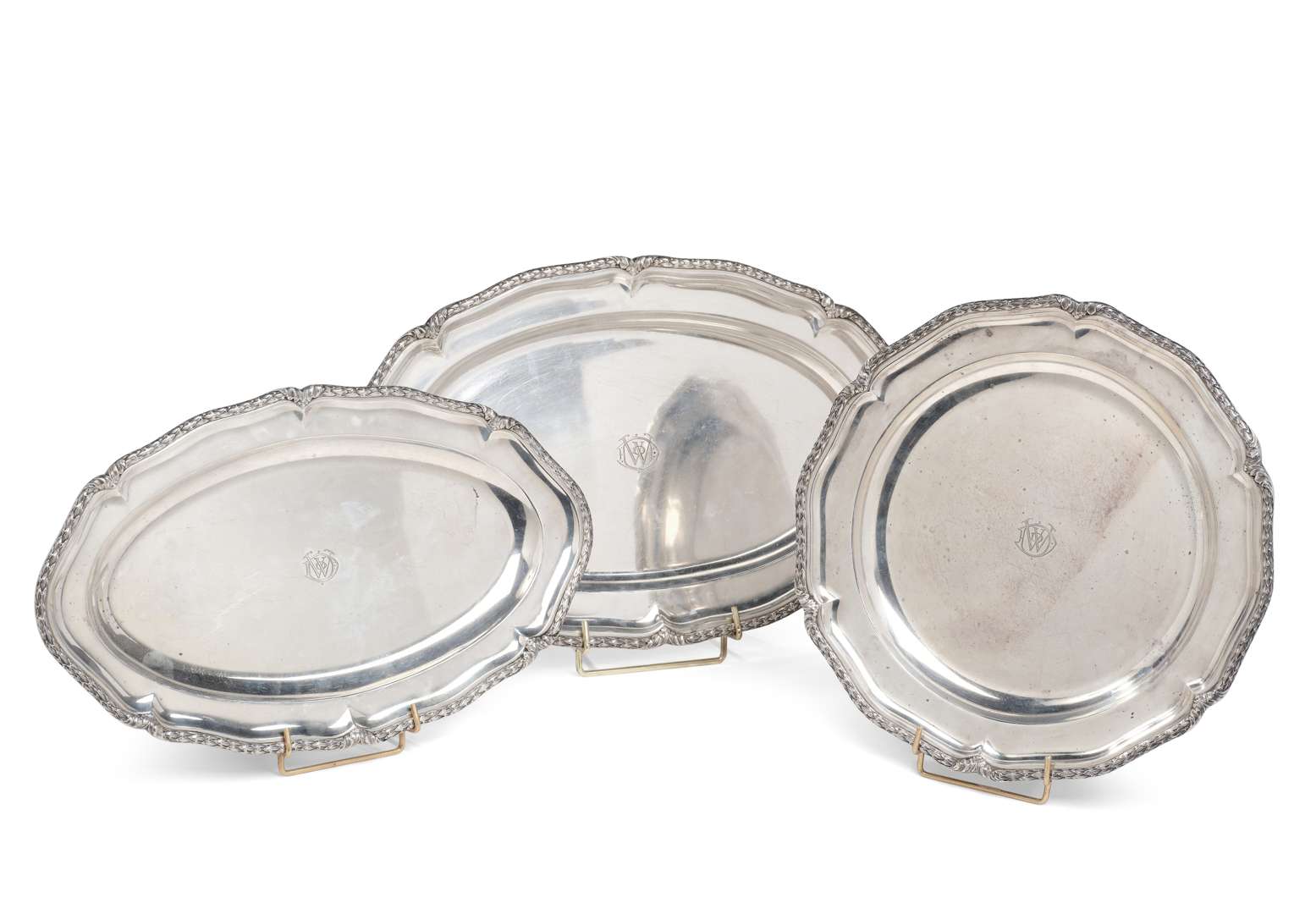 en argent, deux ovales et un circulaire. Les bordures chantournées et agrémentées d'une frise de lauriers. Les bassins monogrammés WDD.