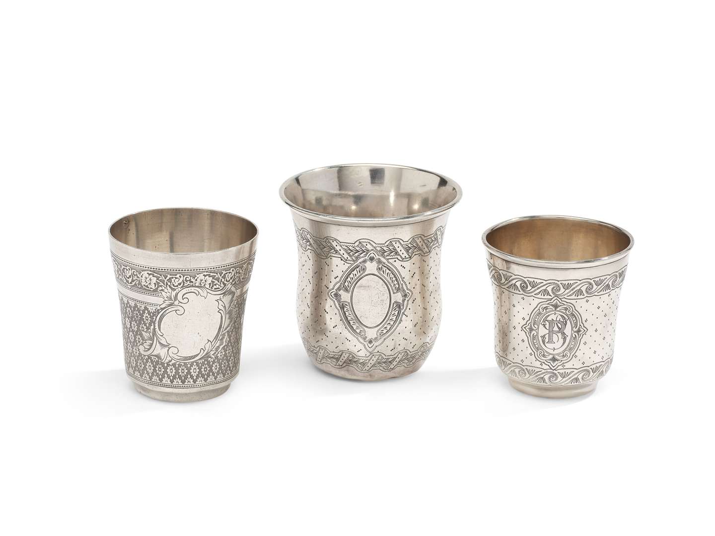 - Deux timbales de forme tulipe à décor gravé de pointillés et de frises de végétaux stylisés. L'une gravée d'un monogramme : P dans un cartouche. La deuxième revêtant un cartouche à l'intérieur uni.