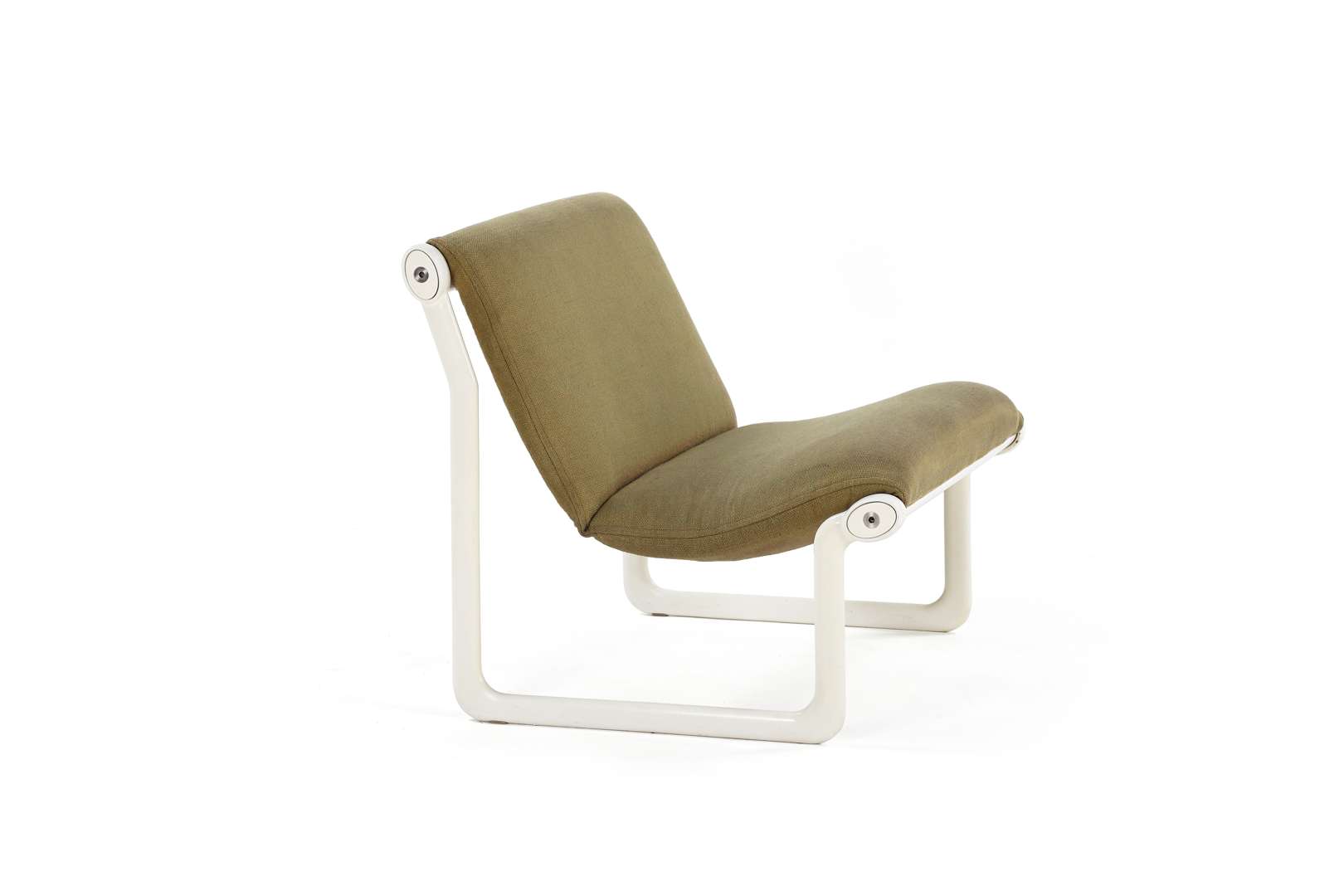 A 'Sling" armchair, c. 1960-1970, white lacquered aluminum structure, seat and backest re-covered with foam, upholstered in light khaki cotton.