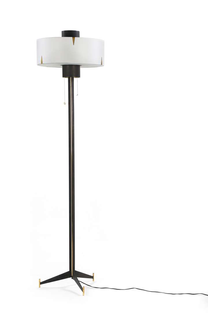 Structure en métal laqué noir, fût cruciforme enserrant un cylindre de laiton, abat-jour cylindrique en rhodoïd blanc animé de pointes en laiton retenant une dalle de verre opalin formant cache-ampoule, reposant sur un piètement tripode, sabots en laiton.