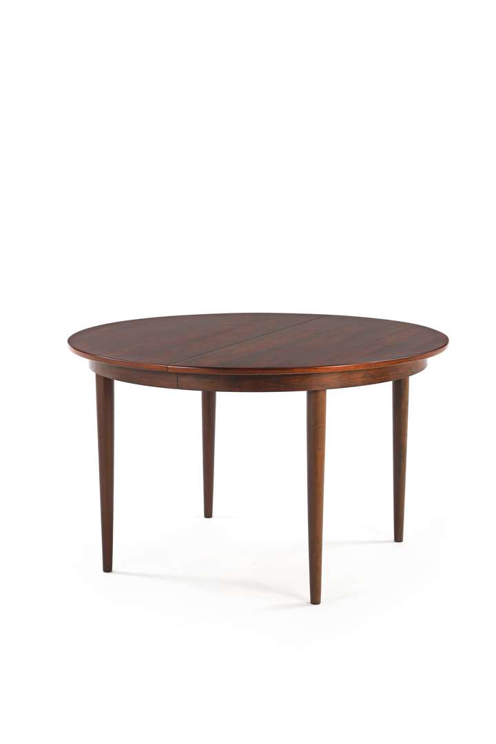 En palissandre verni, plateau circulaire muni de deux allonges, reposant sur un piètement quadripode.