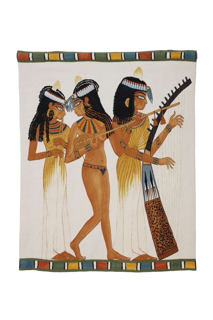 En laine polychrome, à décor de trois musiciennes égyptiennes, dont une dénudée, jouant du luth et de la harpe.
