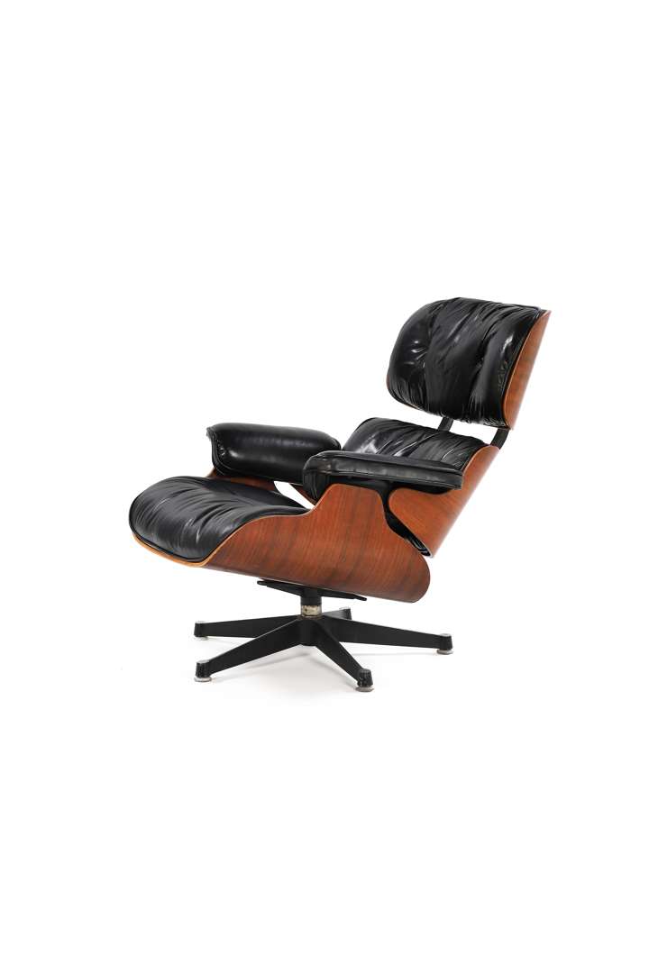 A swiveling armchair, model ‘670' also known as the ‘Lounge Chair' designed in 1956, rosewood plywood structure, seat and backrest cushions covered with original black leather, black lacquered aluminum feet.