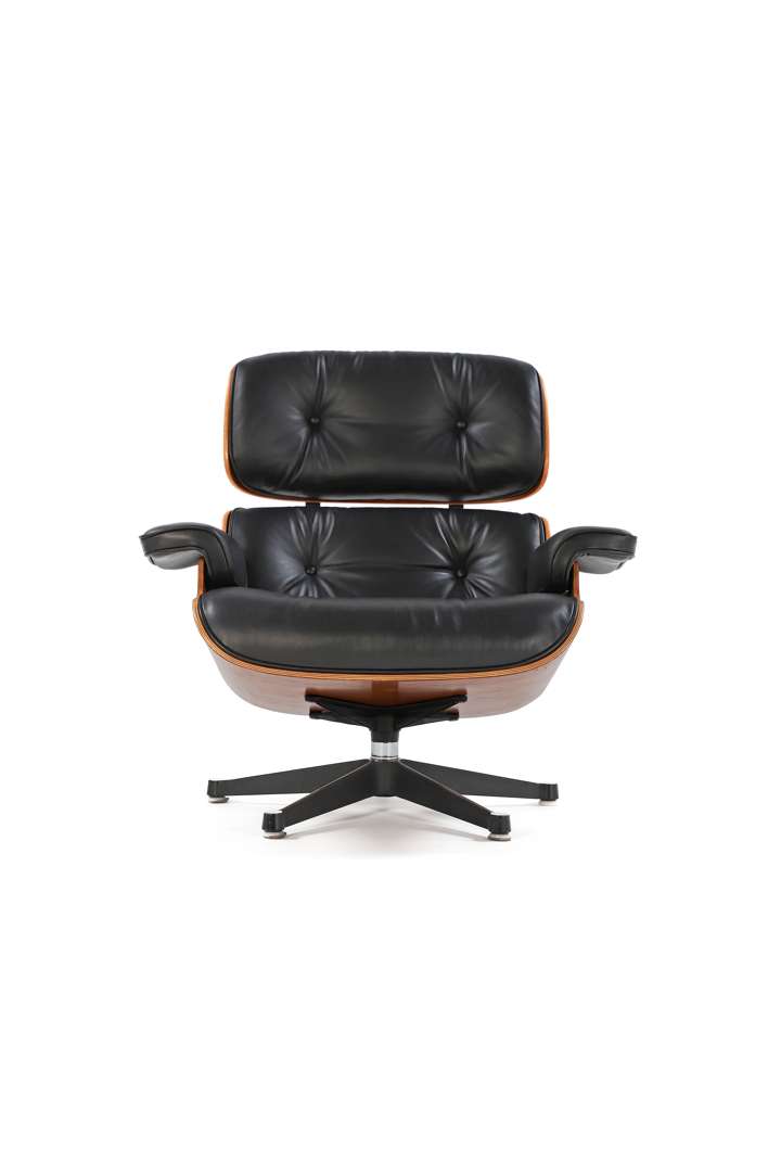 A swivelling armchair, model '670' also known as the 'Lounge Chair' designed in 1956, rosewood plywood structure, seat and backrest cushions covered with black leather, black lacquered aluminum feet. Producer's label.