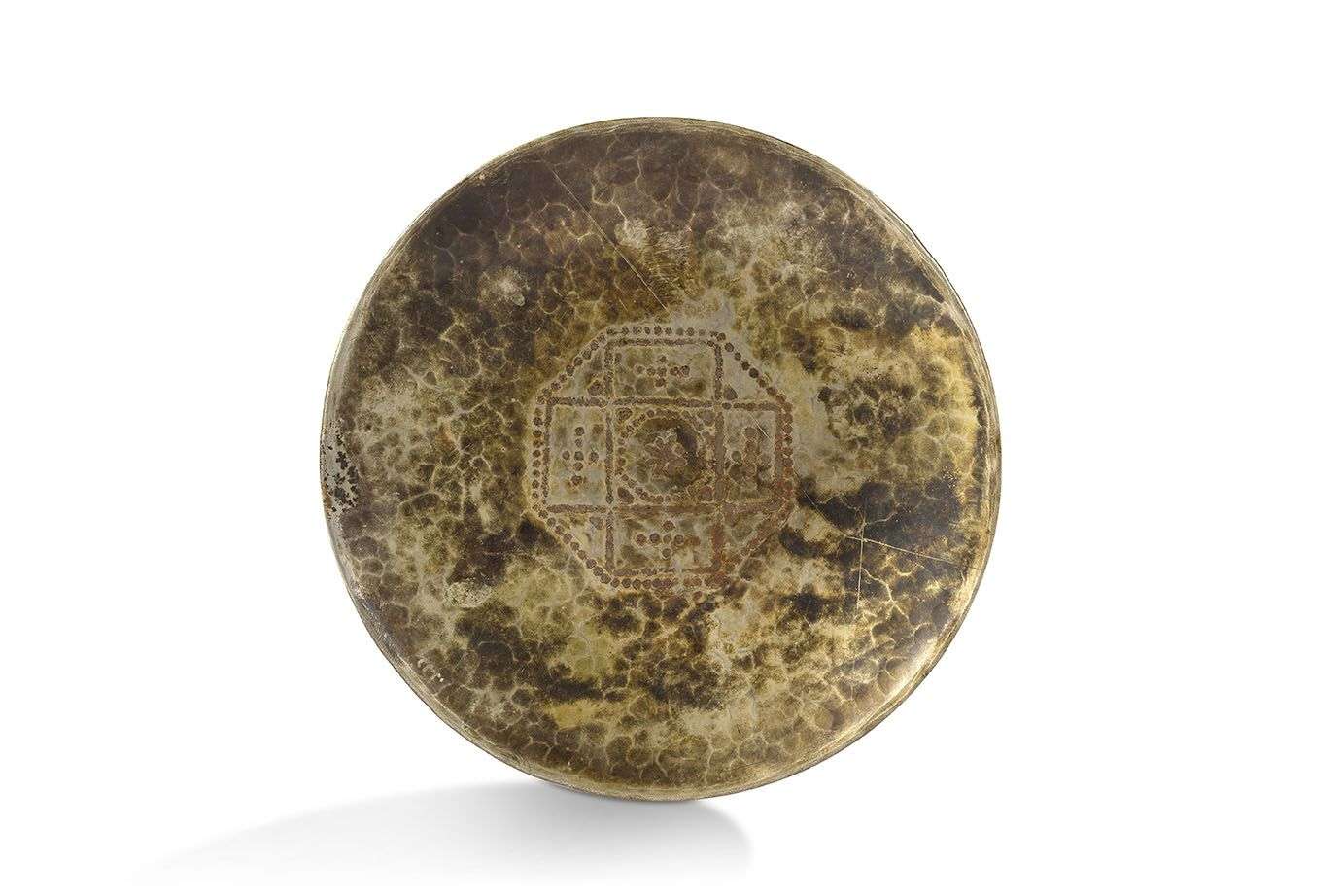 En dianderie de cuivre martelé, ornée en son centre d'un décor géométrique.