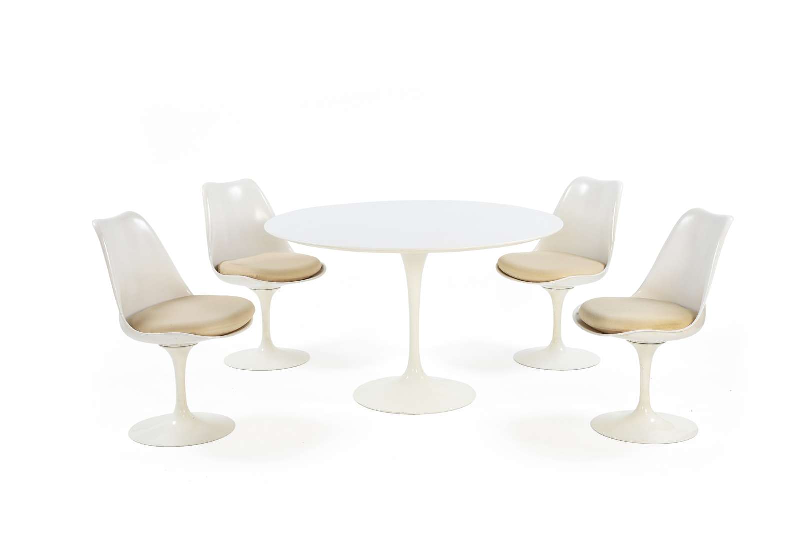 A ‘Tulip' dining furniture, model designed in 1956, including a table and 4 chairs, plywood covered with white melamine top, white lacquered aluminium base, white ABS seat structure, beige fabric cushions.