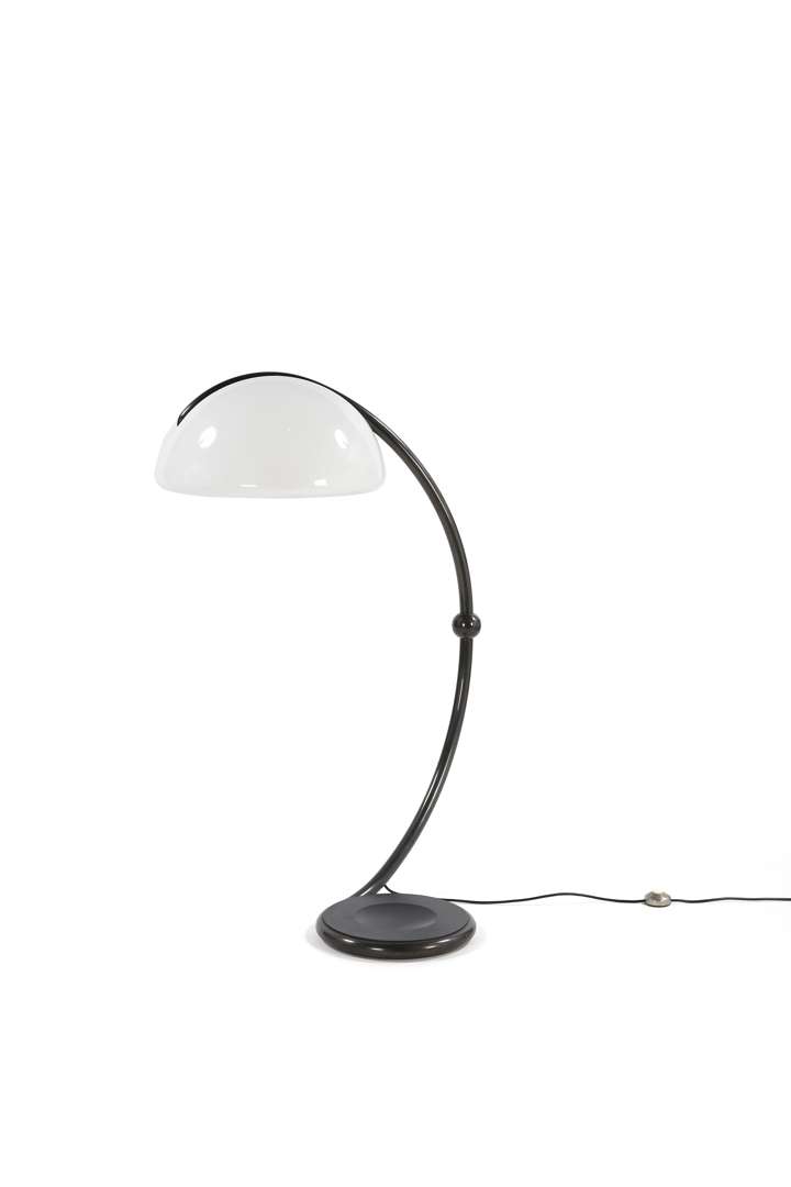 A floor lamp, model ‘2131' known as ‘Serpente' designed in 1965, black lacquered cast iron base, black lacquered metal swivel stem, white Perspex lampshade.