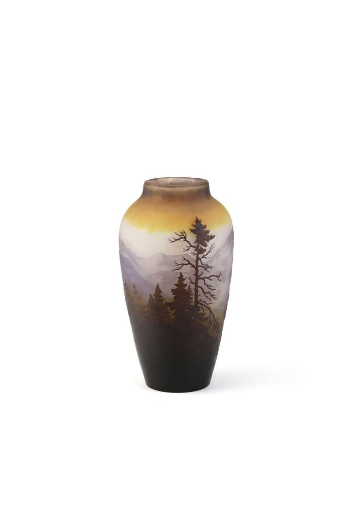 En verre multicouche brun et violet sur fond satiné et jaune, à décor gravé à l'acide d'un paysage montagneux.