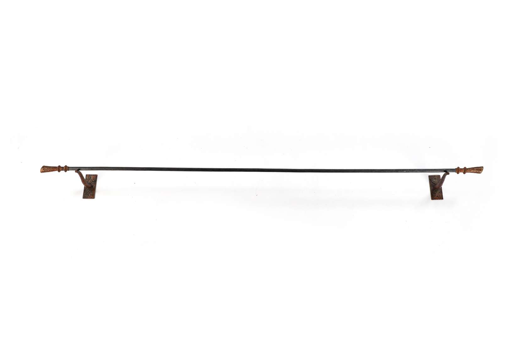 A curtain rod, c. 2000, iron structure, patinated bronze finials. Stamped.