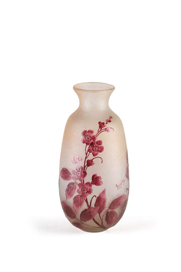 En verre multicouche pourpre sur fond givré, à décor gravé à l'acide et émaillé de branches et fleurs de prunus.