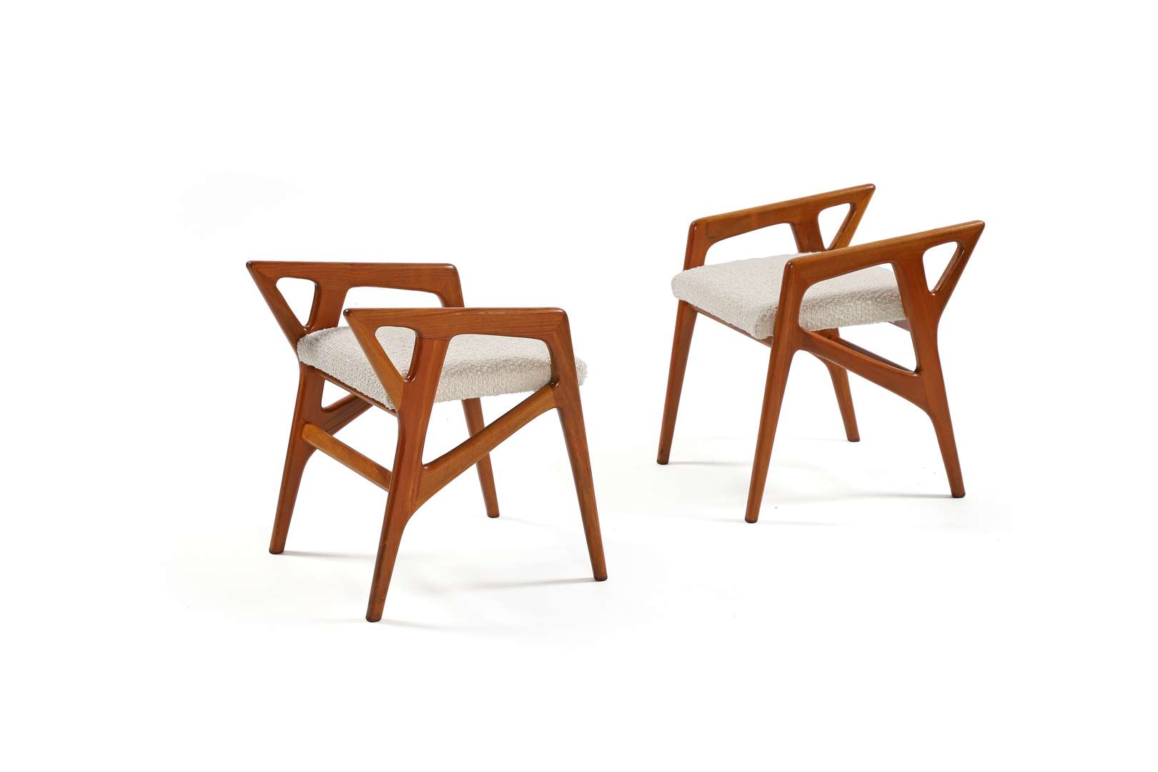 A pair of stools, model ‘687' designed c. 1950, walnut structure, later white upholstery.
