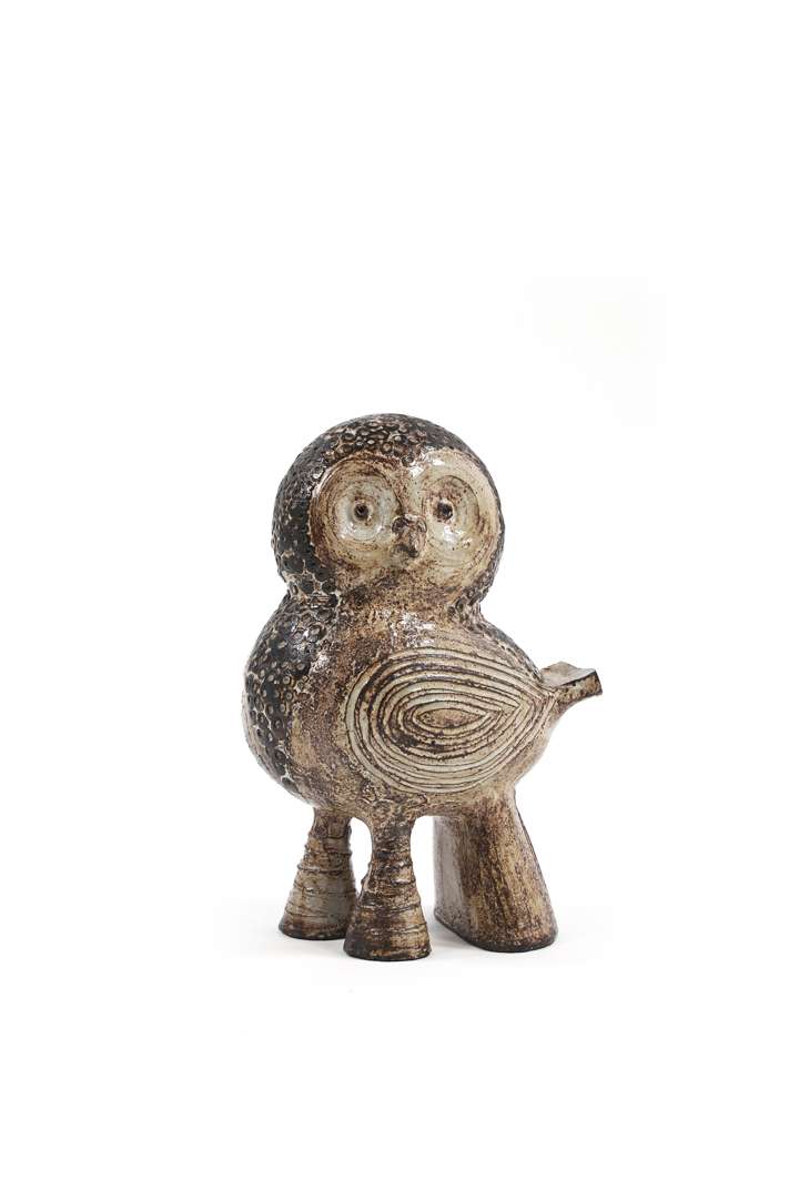 Représentant une chouette, en terre chamottée, émail brun et beige jaspé de brun, à décor de pastilles, le corps orné d'orifices à l'arrière.
