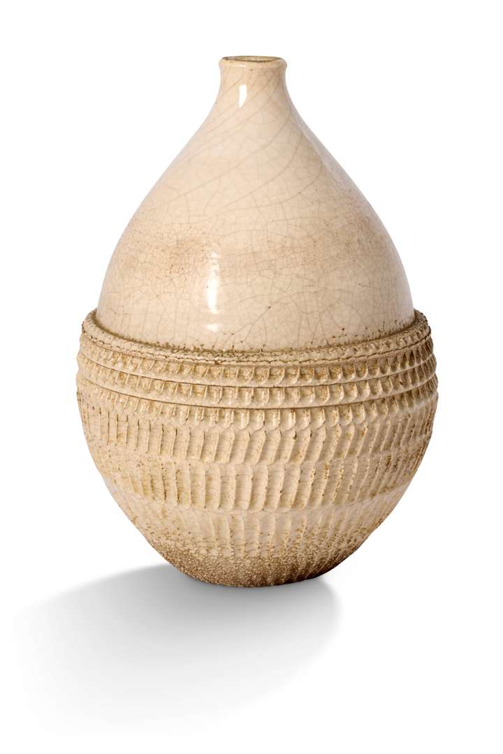 En faïence, à décor africaniste de larges frises de scarifications géométriques à la mollette, émail blanc craquelé sur fond terre.
