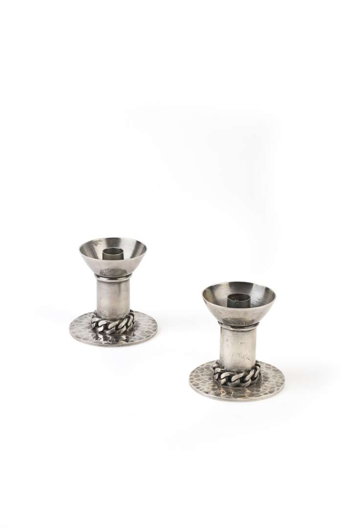 A pair of silver-plated metal candle holders, partially hammered. Signed and silversmith's hallmarks.