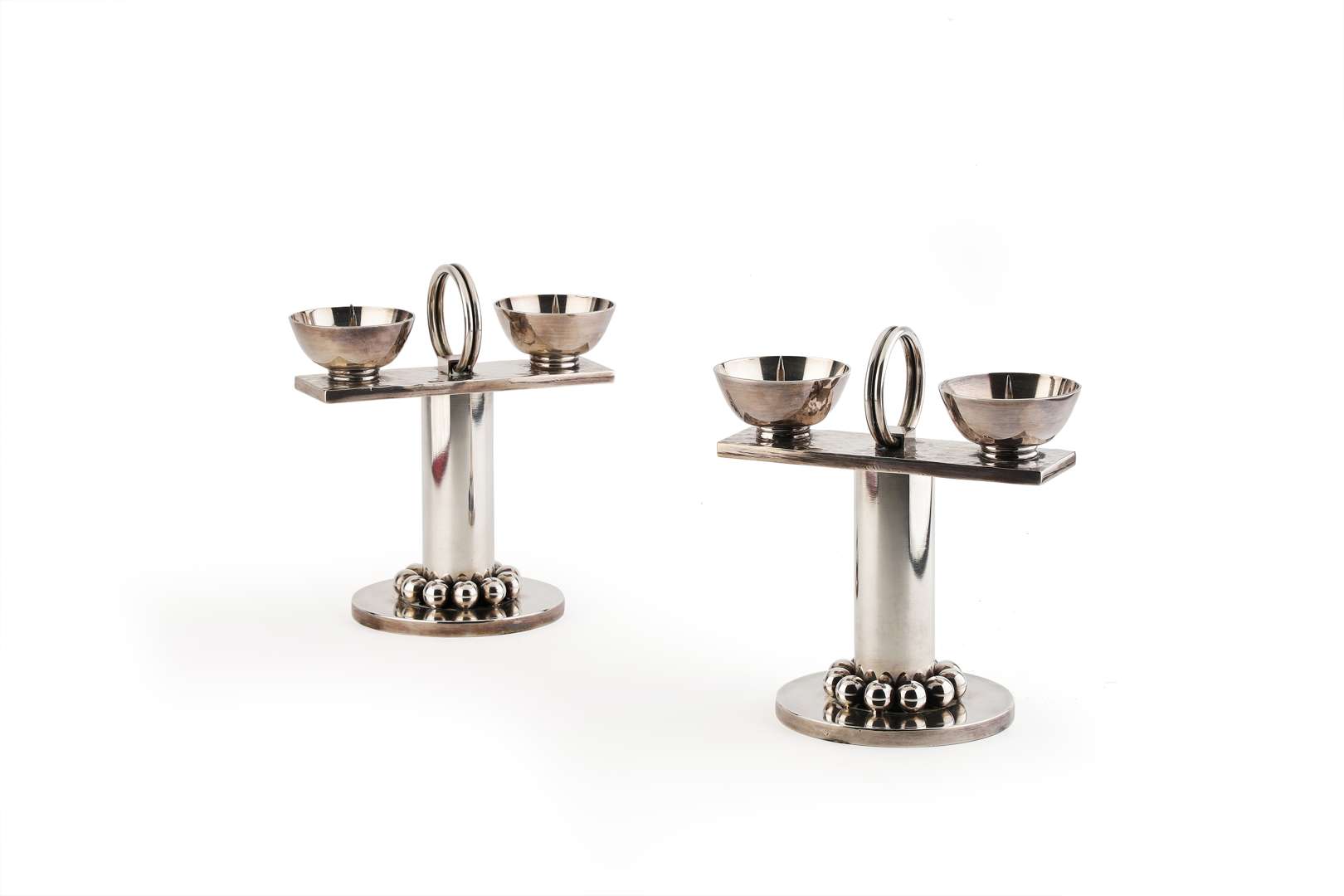 En métal argenté, chacun à deux lumières, platine rectangulaire à surface martelée accueillant deux bobèches encadrant un double anneau de préhension, large fût cylindrique orné à la base d'une frise de sphères, reposant sur une base circulaire lisse.